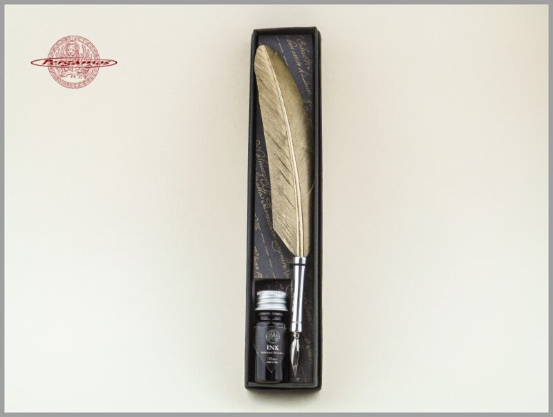 GOLD FEATHER SET WITH INK. Height 20 Cm.